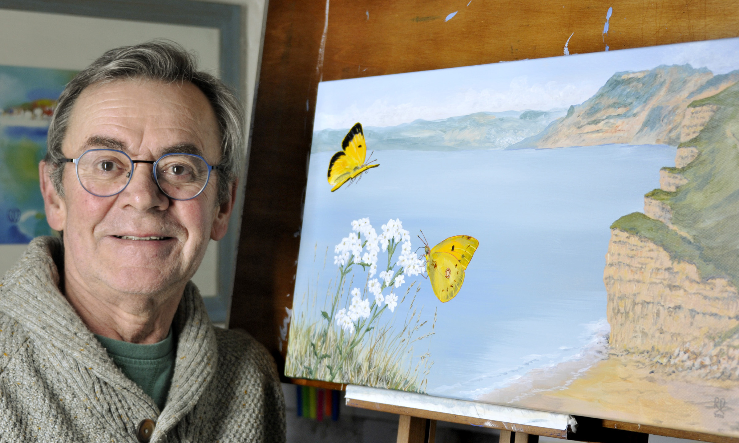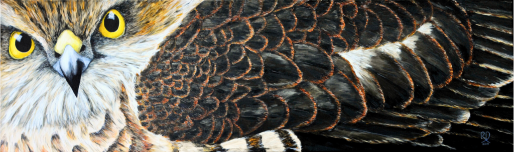 Working in acrylic, watercolour and gouache, Ron has developed a distinctive illustrative style. His subjects range from richly detailed studies of animals, birds and insects to more personal, evocative compositions shaped by memory and subconscious thought. Familiar landmarks of the Jurassic Coast and wider West Country appear throughout his work, though wildlife remains at its heart.